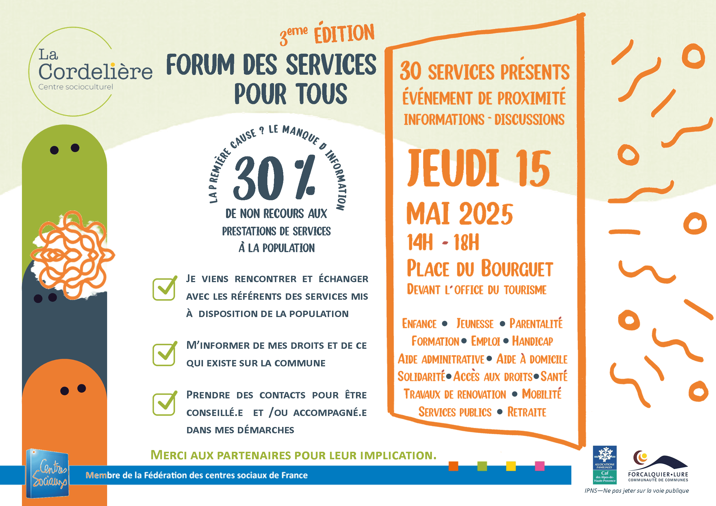 Le Forum se tient sur la place publique, devant l’Office du Tourisme. Il rassemble une trentaine de structures au service de l’intérêt général pour investir le temps d’une demi-journée l’espace public et échanger avec la population des activités qu’elles proposent.